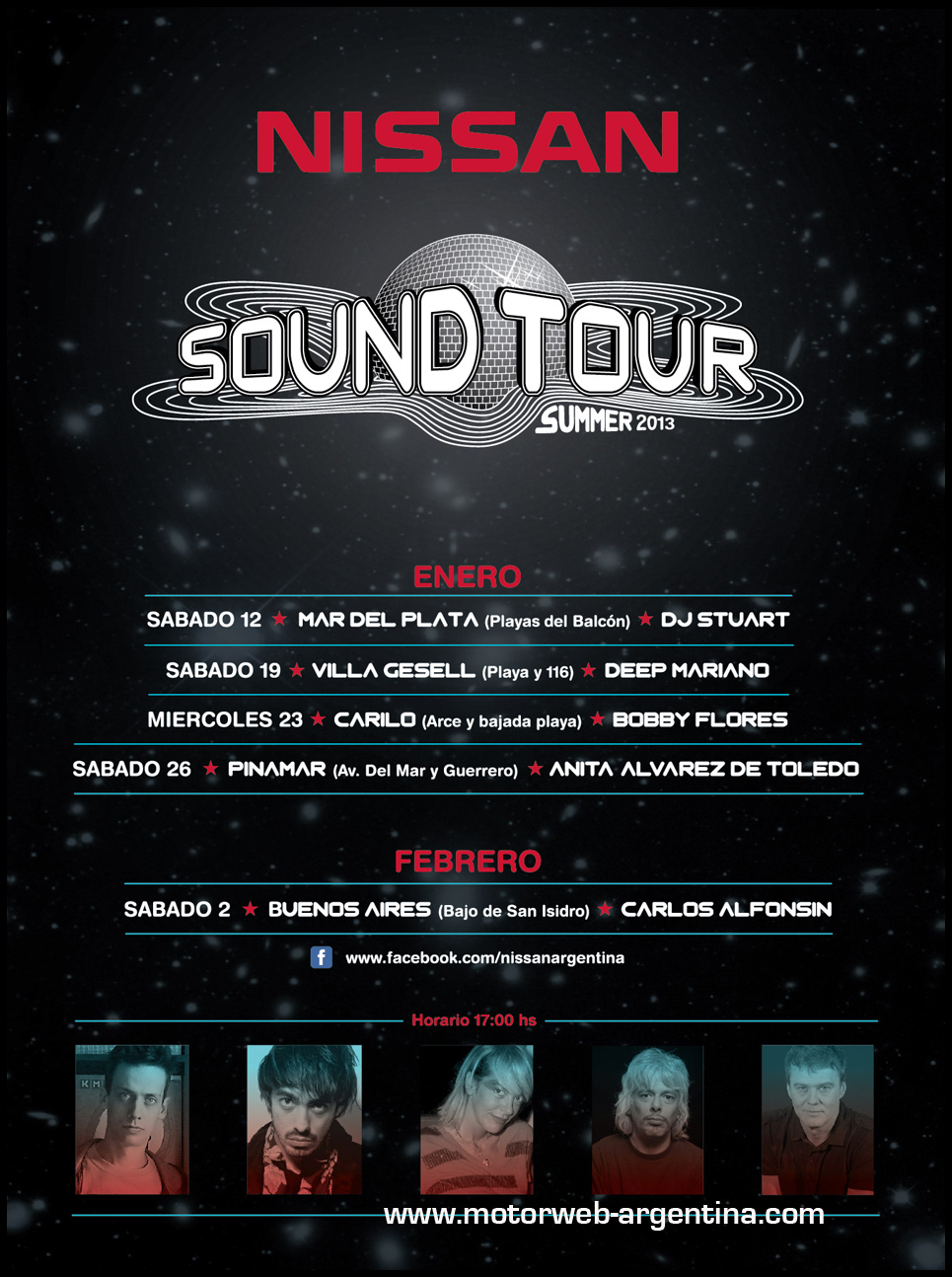 Nissan Argentina anuncia su promoción de verano en los principales centros turísticos de la provincia de Buenos Aires. En busca de potenciar la exposición de marca a nuevos públicos, se inicia el “Nissan Sound Tour” – Summer 2013. Avant-Premiere de los nuevos Versa y Altima que llegarán a nuestro mercado durante este año.