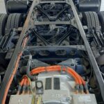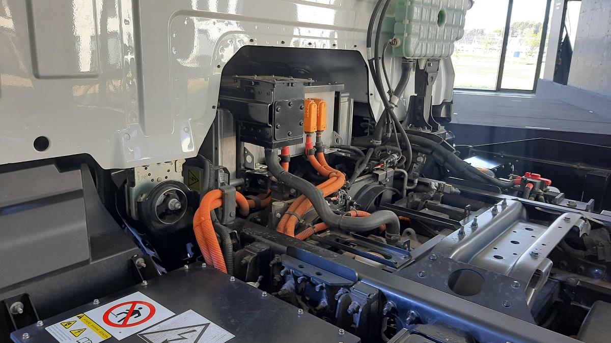 Por debajo de la cabina, donde todos los camiones convencionales llevan el motor de combustión, en este caso el lugar queda reservado para los accesorios, entre ellos el sistema de aire acondicionado, o bien el sistema hidráulico de la dirección.