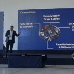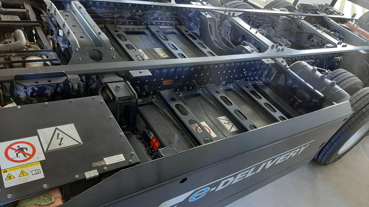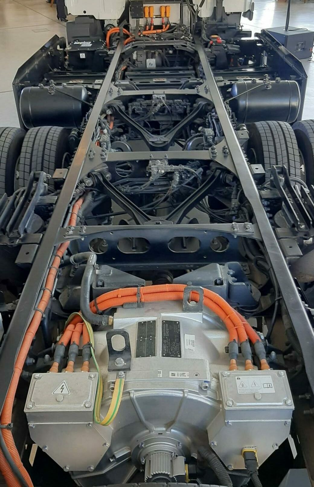 El principal cambio del e-Delivery es que el motor eléctrico está ubicado en la parte trasera, por detrás de los ejes traseros. Es que en este caso monta un segundo eje, ya que en caso de ser cargado con hasta 9 toneladas, sería mucha la fuerza sobre un único eje posterior.