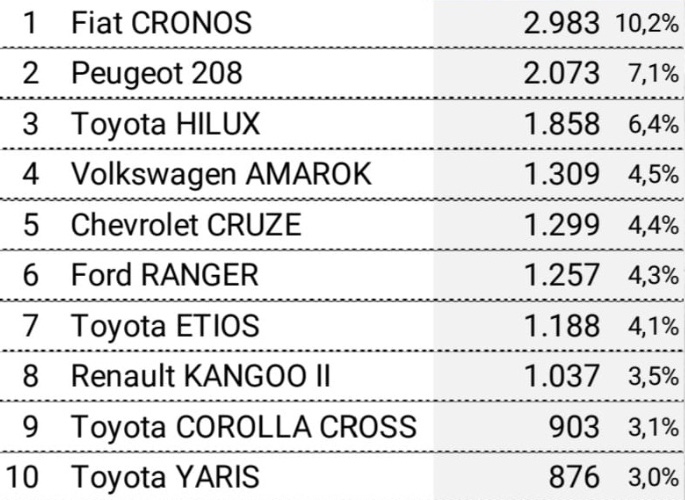 Por modelos, Fiat Cronos, con 2.983 (10,2%) encabezó el listado de más vendidos. Le sigue Peugeot 208, con 2.073 (7,1%) y Toyota Hilux, 1.858 (6,4%). Luego aparecen Volkswagen Amarok, 1.309 (4,5%) y Chevrolet Cruze, 1.299 (4,4%). Por marcas, Toyota lideró el ranking de abril con 6.063 unidades (20,7% del total). Segunda está Fiat, 4.378 (15%). Completan Volkswagen, 3.803 (13%); Renault, 3.087 (10,6%) y Peugeot, 2.794 (9,6%).